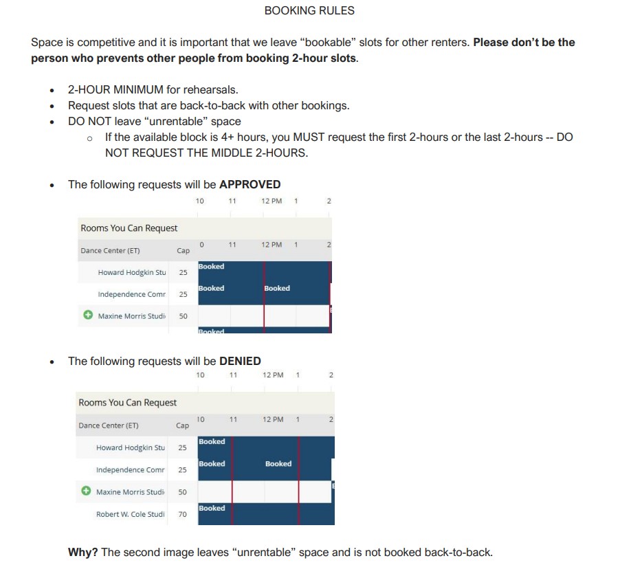 Web App Booking Rules Front Desk Team September 24, 2025 02:14 Updated WebAppBookingRules.jpg 100 KB Download Related articles How do I request space? How far out is space available to book? Can I see your studio availability? What is your cancellation policy? What are your rates? Comments 0 comments Article is closed for comments.